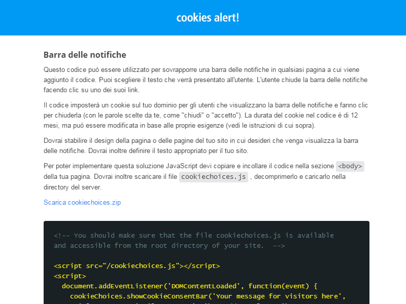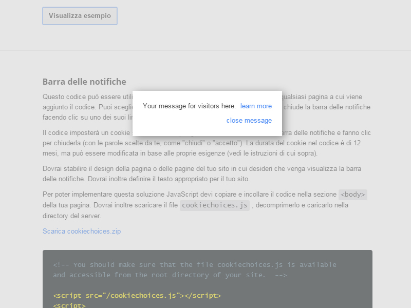 Per poter implementare questa soluzione JavaScript devi copiare e incollare il codice nella sezione <body> della tua pagina. Dovrai inoltre scaricare il file cookiechoices.js , decomprimerlo e caricarlo nella directory del server.